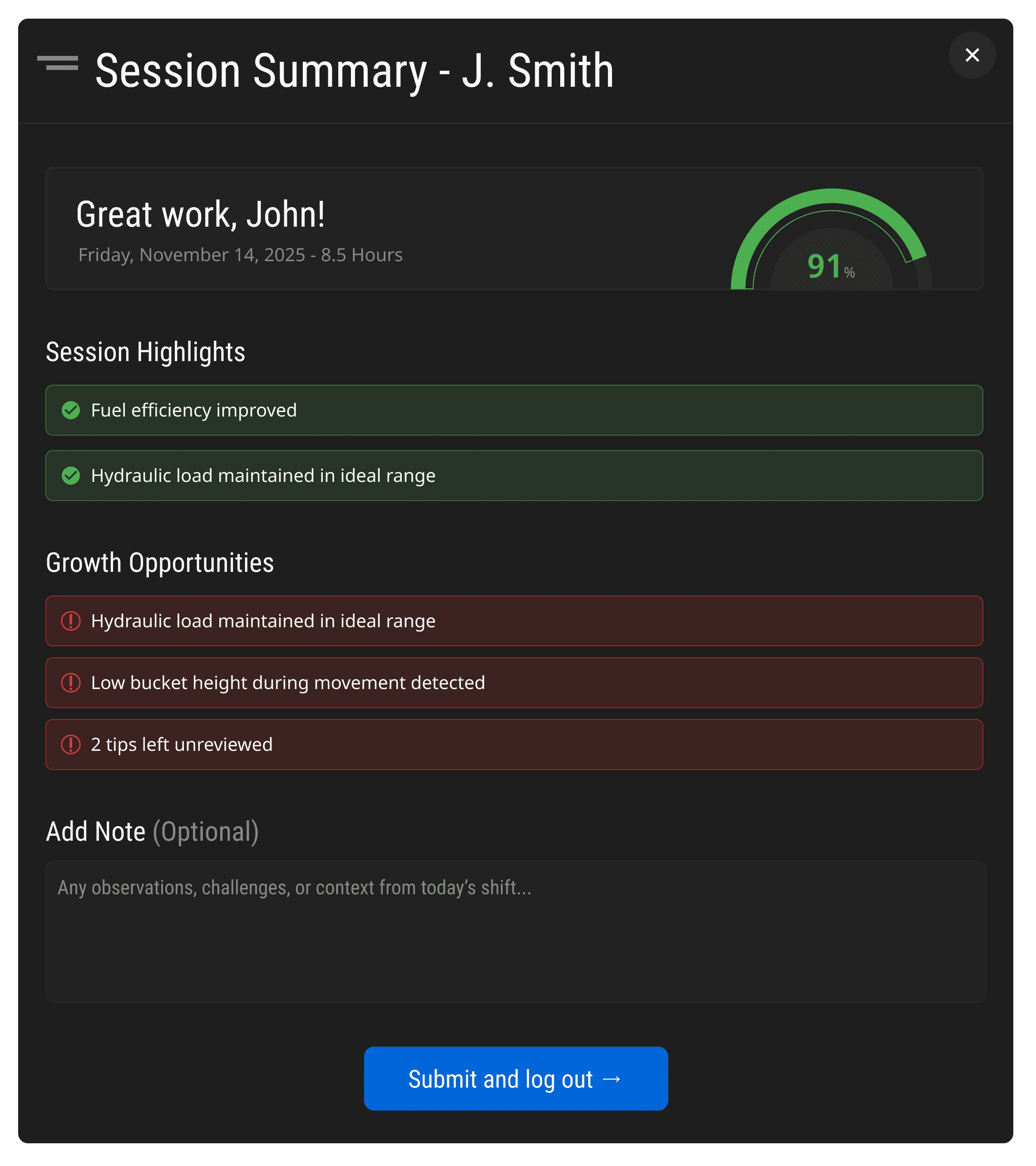 At the end of each shift, operators can add context through notes to coaching alerts affected by terrain, equipment, or site conditions. This addresses the "tattletale" perception by giving operators control over how their performance is interpreted, aligning operator and manager understanding while building trust and improving data accuracy.